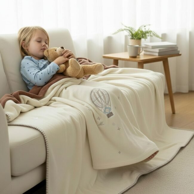 Offrez à votre enfant son havre de douceur avec ce plaid en laine pensé pour ses moments cocooning. Sa texture moelleuse et chaleureuse l’enveloppe comme un câlin réconfortant, créant une bulle de bien-être parfaite pour les histoires du soir, les après-midi devant un dessin animé ou les siestes improvisées. La laine naturelle diffuse une chaleur enveloppante qui protège des frissons d’hiver tout en laissant la peau respirer. Léger mais douillet, ce plaid devient vite le compagnon préféré de votre enfant : pour se lover dans le canapé, construire une cabane ou simplement se sentir en sécurité. Sa qualité assure une douceur qui perdure, lavage après lavage, tandis que ses coloris apaisants s’harmonisent délicatement avec l’univers de sa chambre.