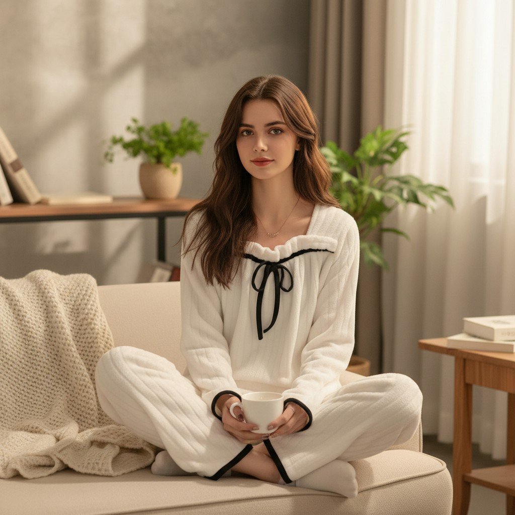 Prête à vivre l’expérience cocooning à la maison ? Ce pyjama femme hiver pilou va littéralement transformer vos soirées d’hiver en moments de pur bonheur ! Dès que vous l’enfilez, c’est comme si un nuage moelleux vous enveloppait dans une bulle de douceur. Son col orné d’un petit nœud noir est un détail qui vous fait vous sentir belle et féminine, même en mode total relax. Le tissu léger et doux sculptent joliment votre silhouette pendant que la matière pelucheuse vous protège du froid comme un câlin permanent. Sa couleur blanche vous propose un look chic et raffiné en intérieur. Un choix à faire pour celles qui veulent allier élégance et chaleur en période de froid.